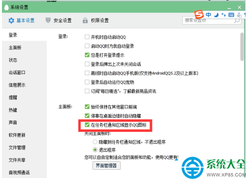 3、在【登录设置】下的【主面板】项下,查看【在任务栏通知区域显示QQ图标】这一项前有没有打勾,如果没有打钩,那么把它勾选上,然后退出即可;