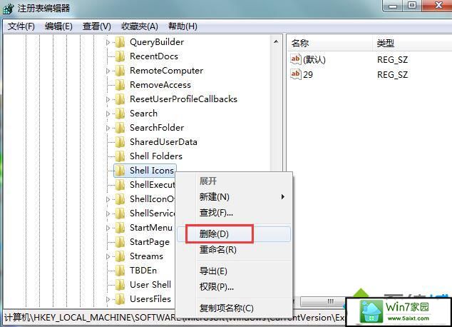 3、在注册表中依次找到HKEY_LoCAL_MACHinE/soFTwARE/Microsoft/windows/CurrentVersion/Explorer/shell icons;