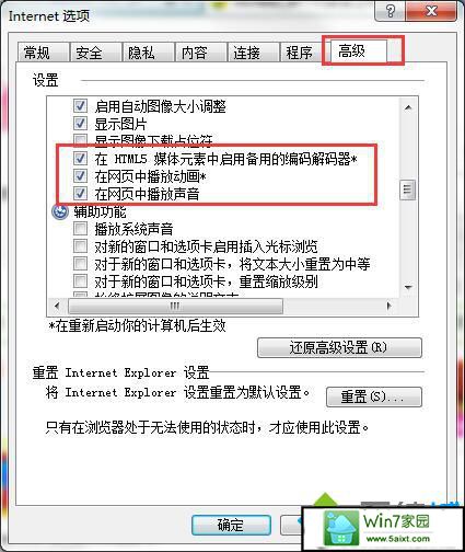 2、在internet界面中点击“高级”,然后下拉找到并勾选“在网页中播放动画”选项,然后点击确定退出即可,然后就可以使用浏览器播放网页视频了。