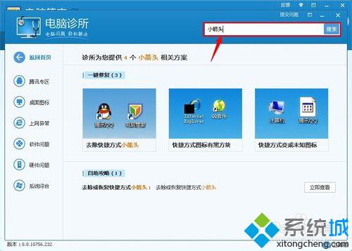 2、打开电脑诊所,在搜索框中写入“小箭头”,打开搜索;
