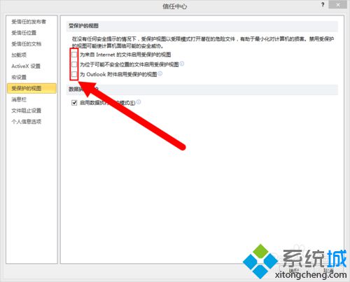 5、打开[受保护的视图],把视图里面画勾的三项都去掉,确定;