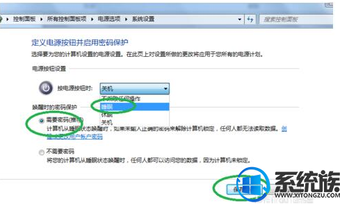 4.进入电源系统配置界面,观察这个界面上有2个地方需要配置,这里配置的是睡眠启动需要密码,所以选择按电源键时为睡眠这个动作,然后选择唤醒需要密码,然后单击保存修改按钮