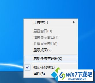 1、右键点击任务栏空白处打开菜单,选择“启动任务管理器”;