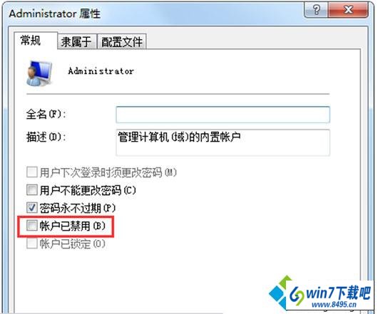 3、右键计算机,选择“管理——本地用户和组——右键点击“Administrator”属性——取消“帐户已停用”选项并确定。
